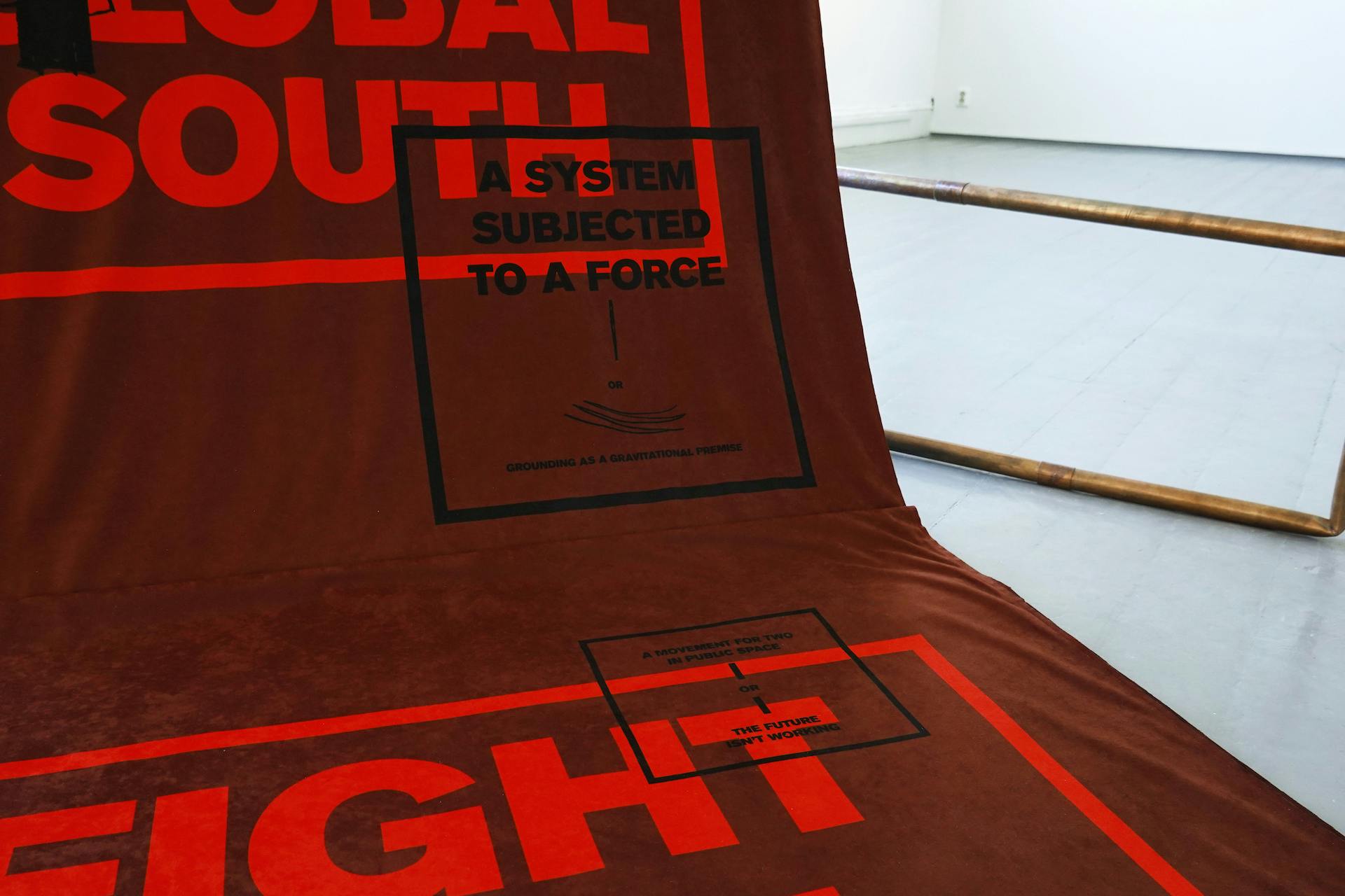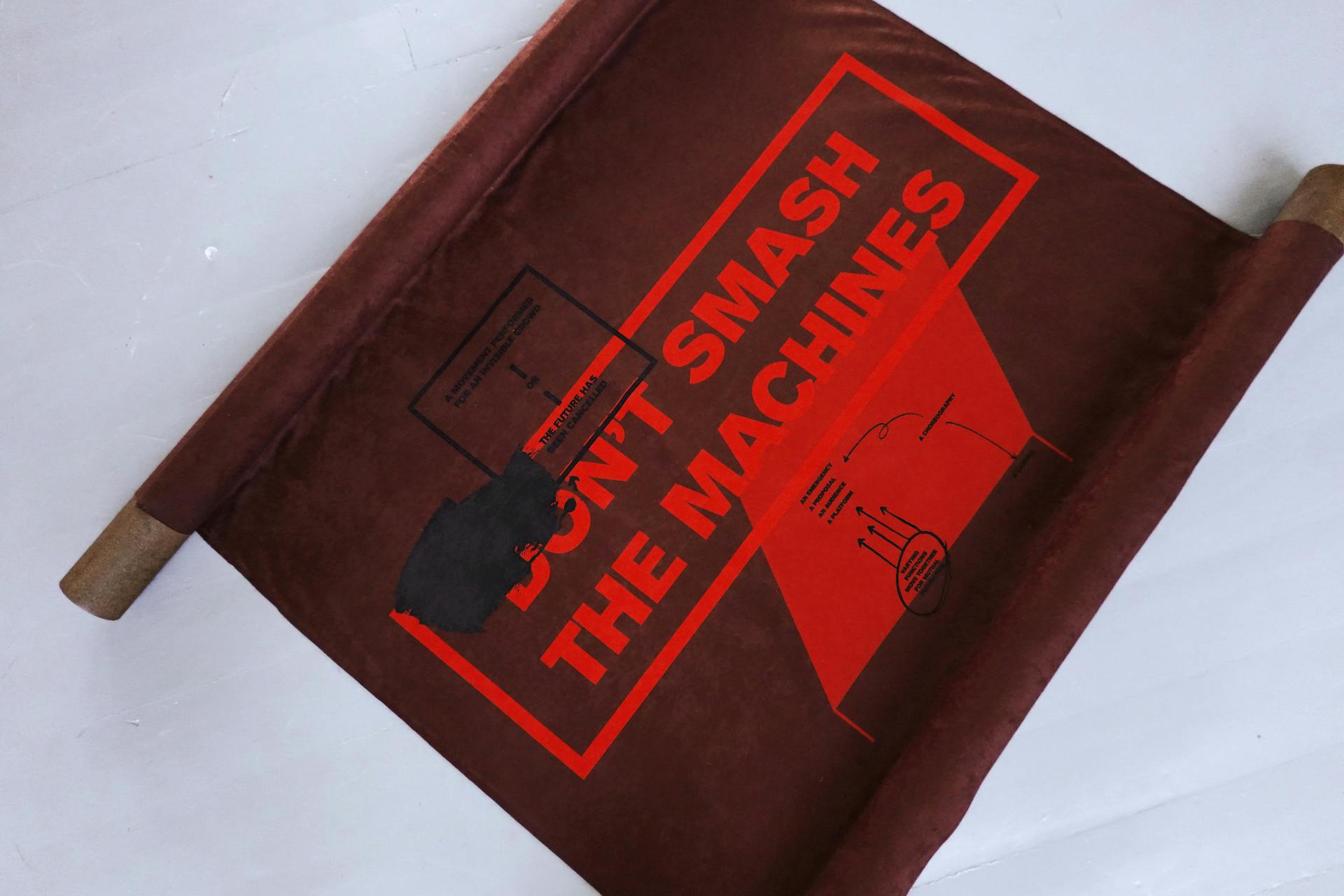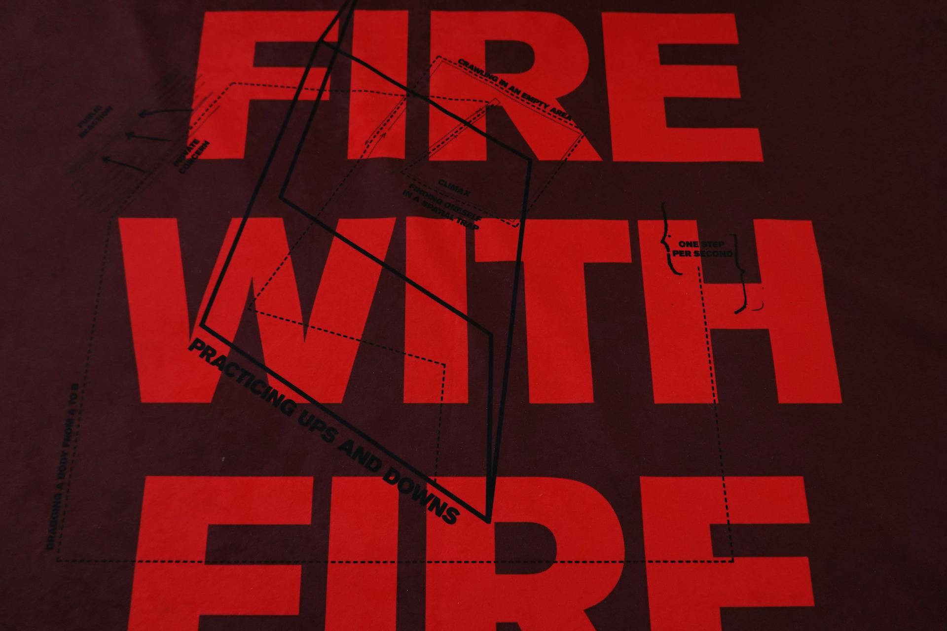 The project presents four diagrams on fire-retardant textile and an audio piece. Each diagram drafts a possible choreography in public space, in which crawling techniques employed in fire fighting are unfolded. Demands made public in the virtual sphere – from online discussion forums to anonymous comments on recent fire incidents – have been selected and re-contextualised for each choreography, proposing four different strategies of action: ‘Don’t smash the machines’, ‘Demand mutual protection’, ‘Fight fire with fire’ and ‘Look at the global south’.