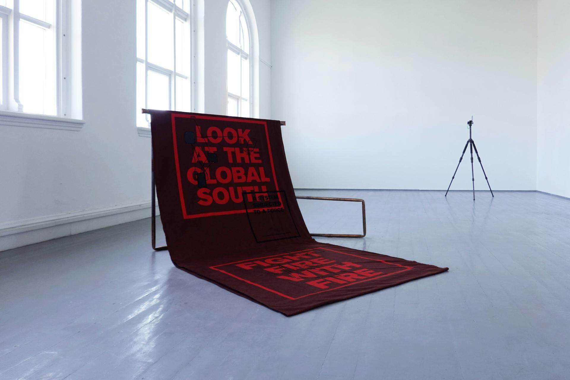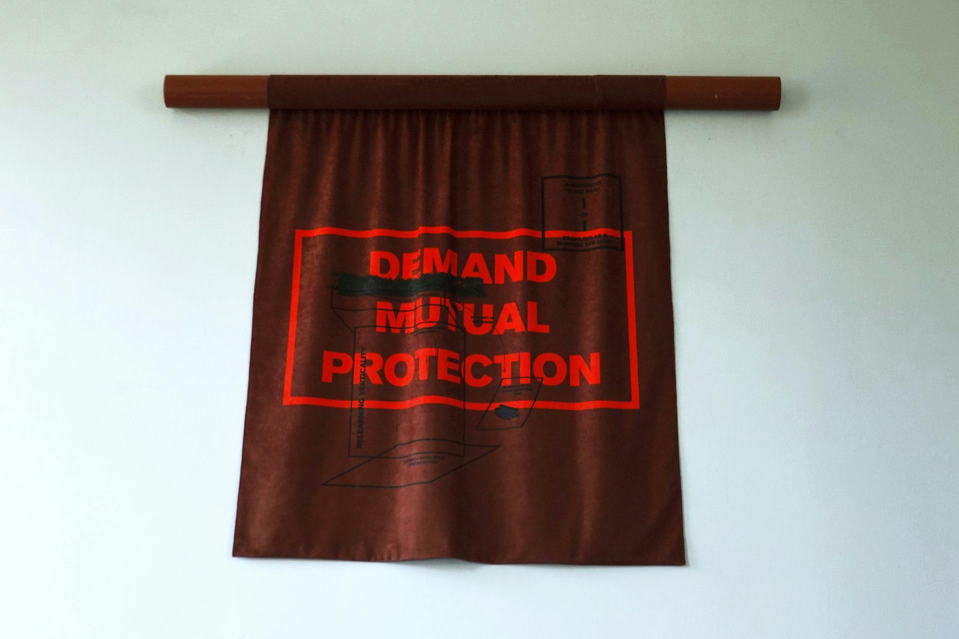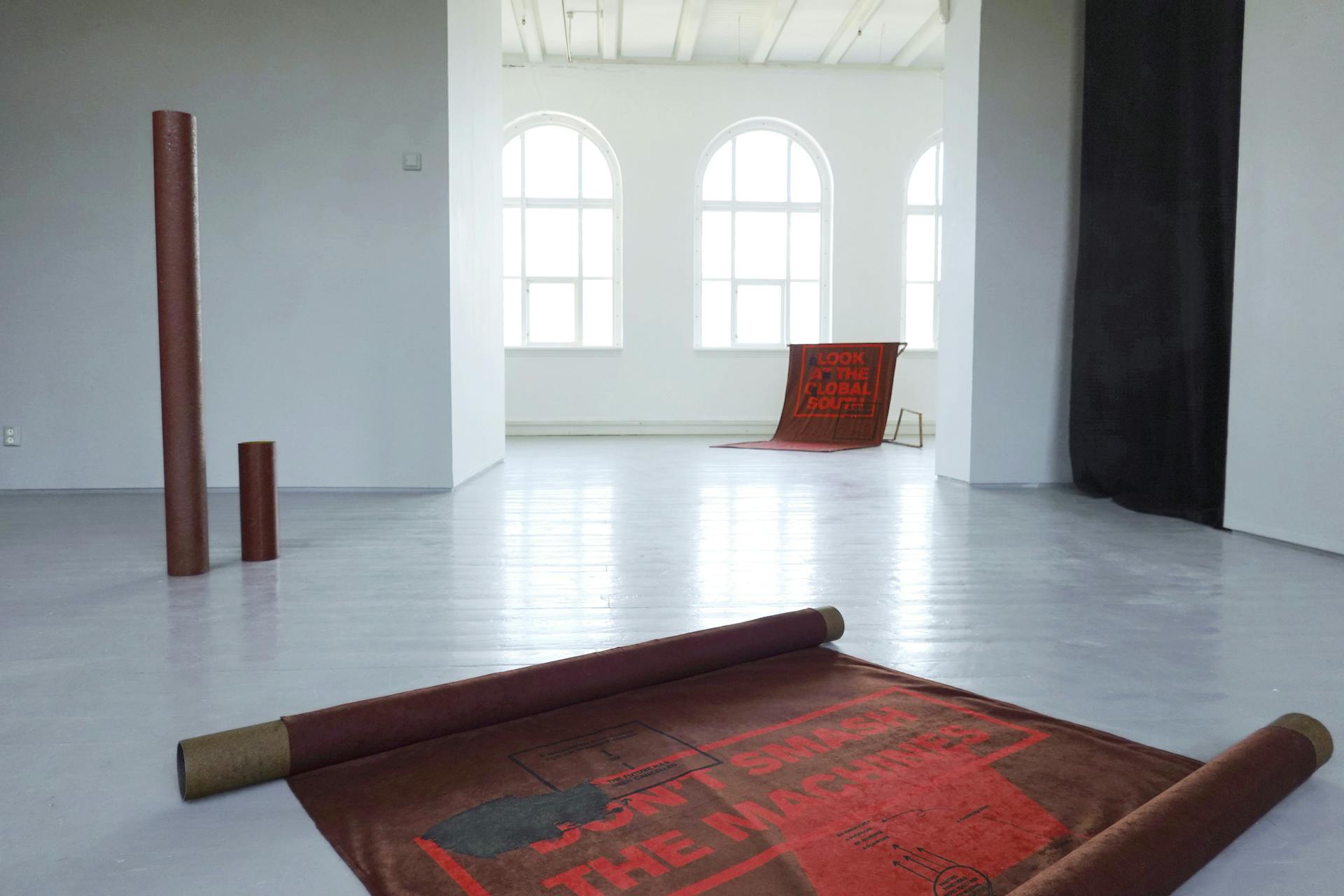 The project presents four diagrams on fire-retardant textile and an audio piece. Each diagram drafts a possible choreography in public space, in which crawling techniques employed in fire fighting are unfolded. Demands made public in the virtual sphere – from online discussion forums to anonymous comments on recent fire incidents – have been selected and re-contextualised for each choreography, proposing four different strategies of action: ‘Don’t smash the machines’, ‘Demand mutual protection’, ‘Fight fire with fire’ and ‘Look at the global south’.