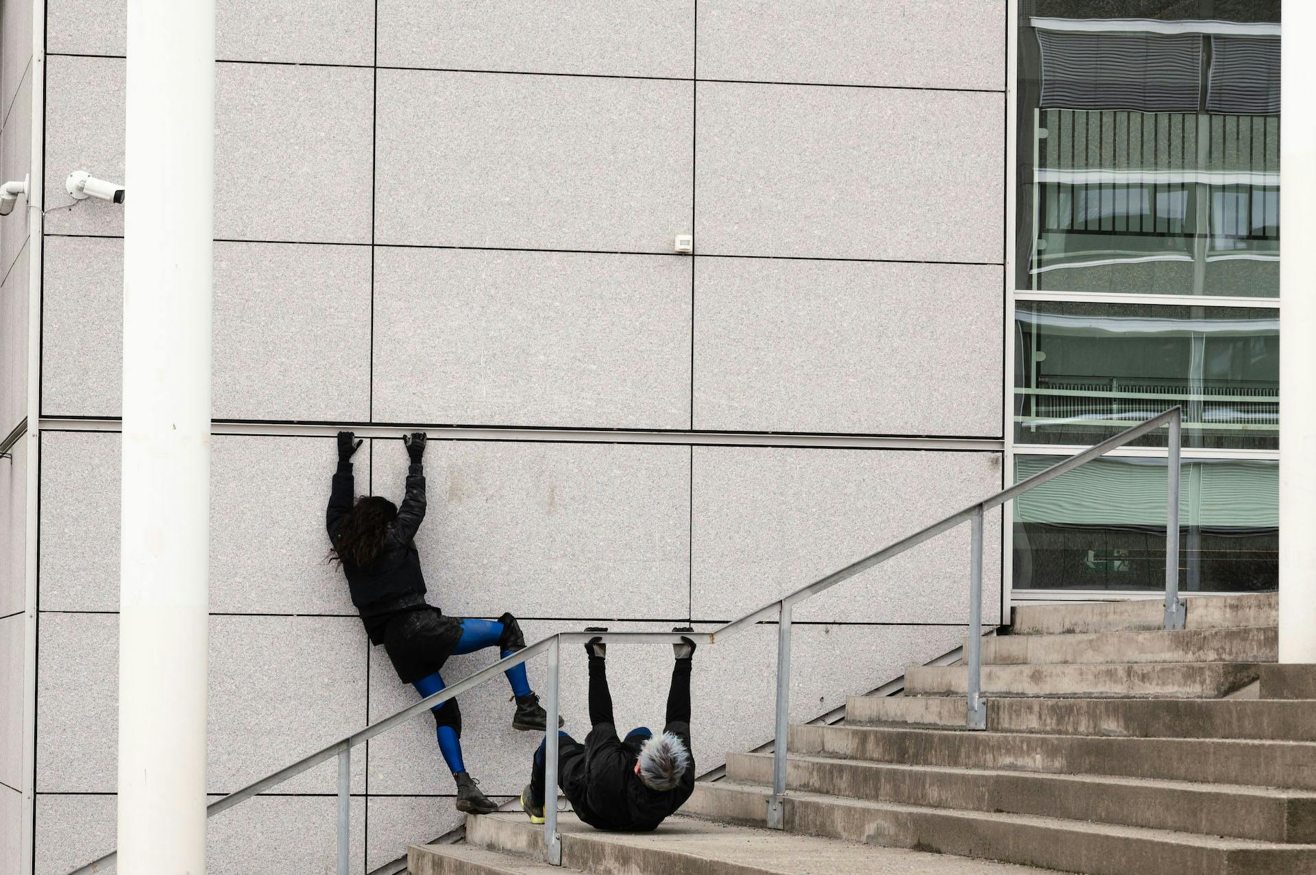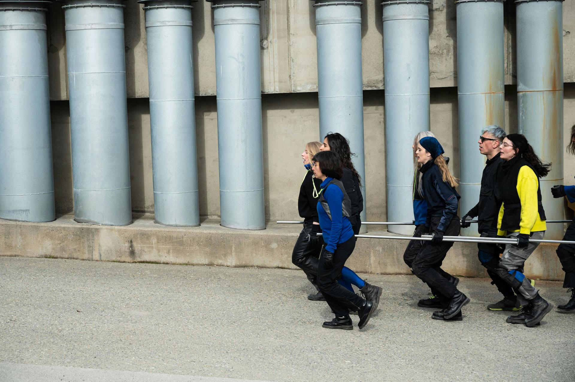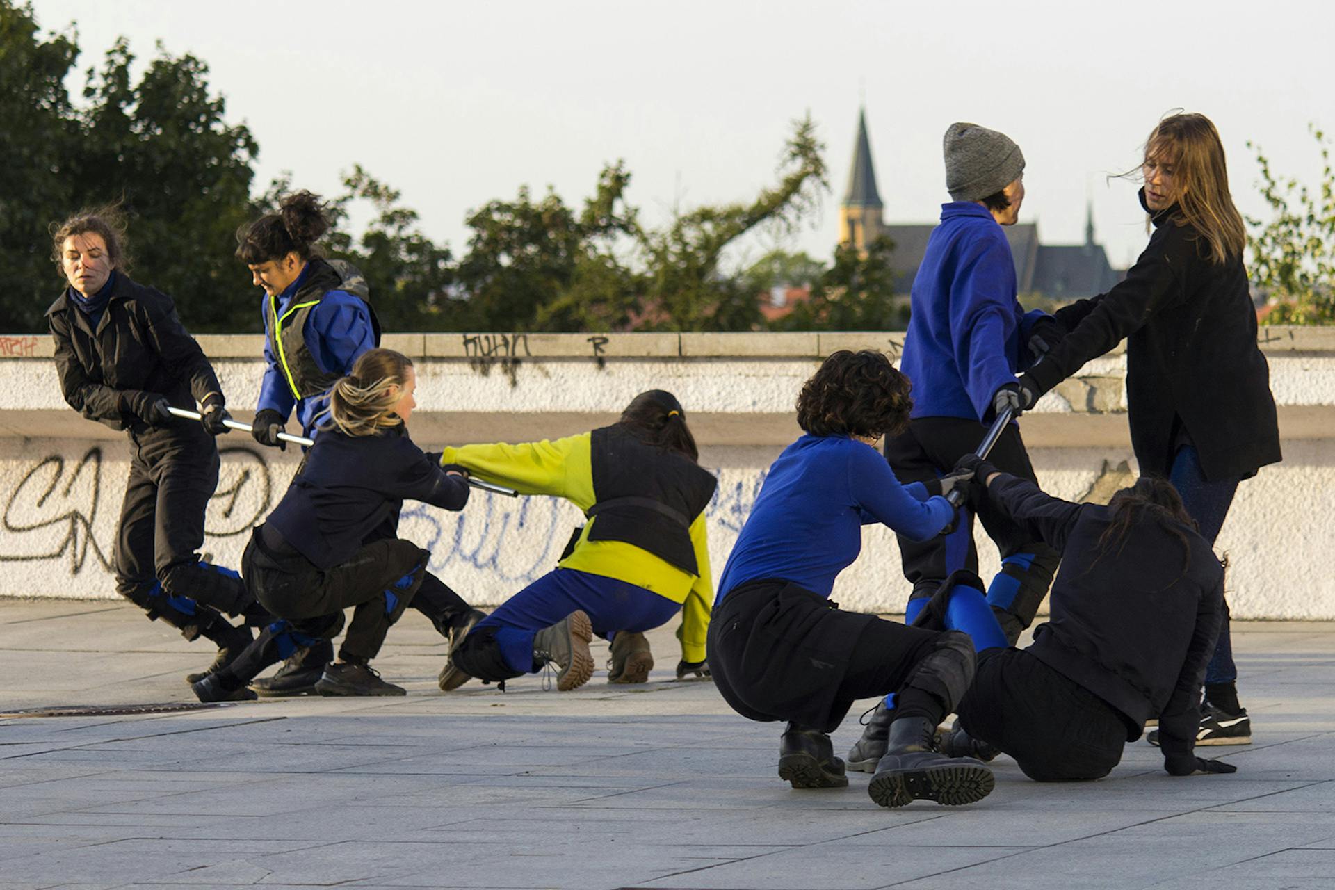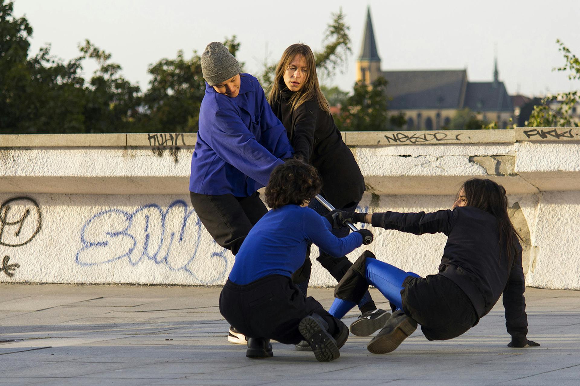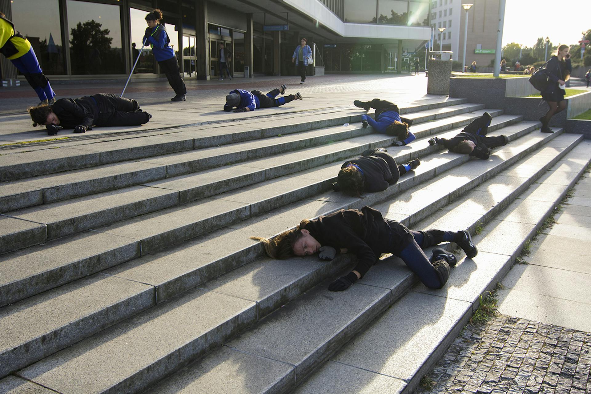 A group of performers drag, carry, and support each other through the city. Almost like a slow painting in motion, their movements appear and disappear among the passersby, merging a long-lasting choreographic composition with the architectural and social patterns of the city.