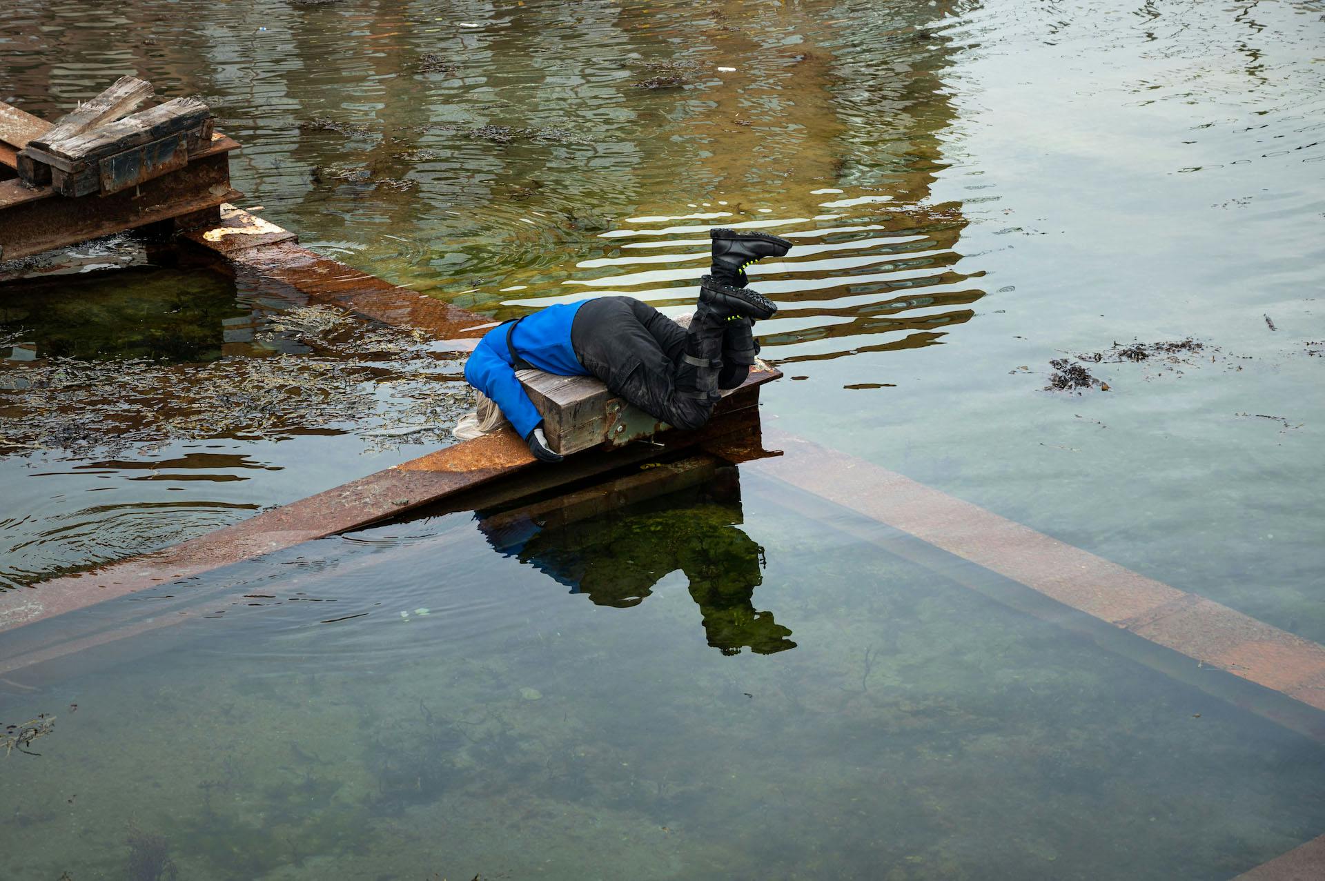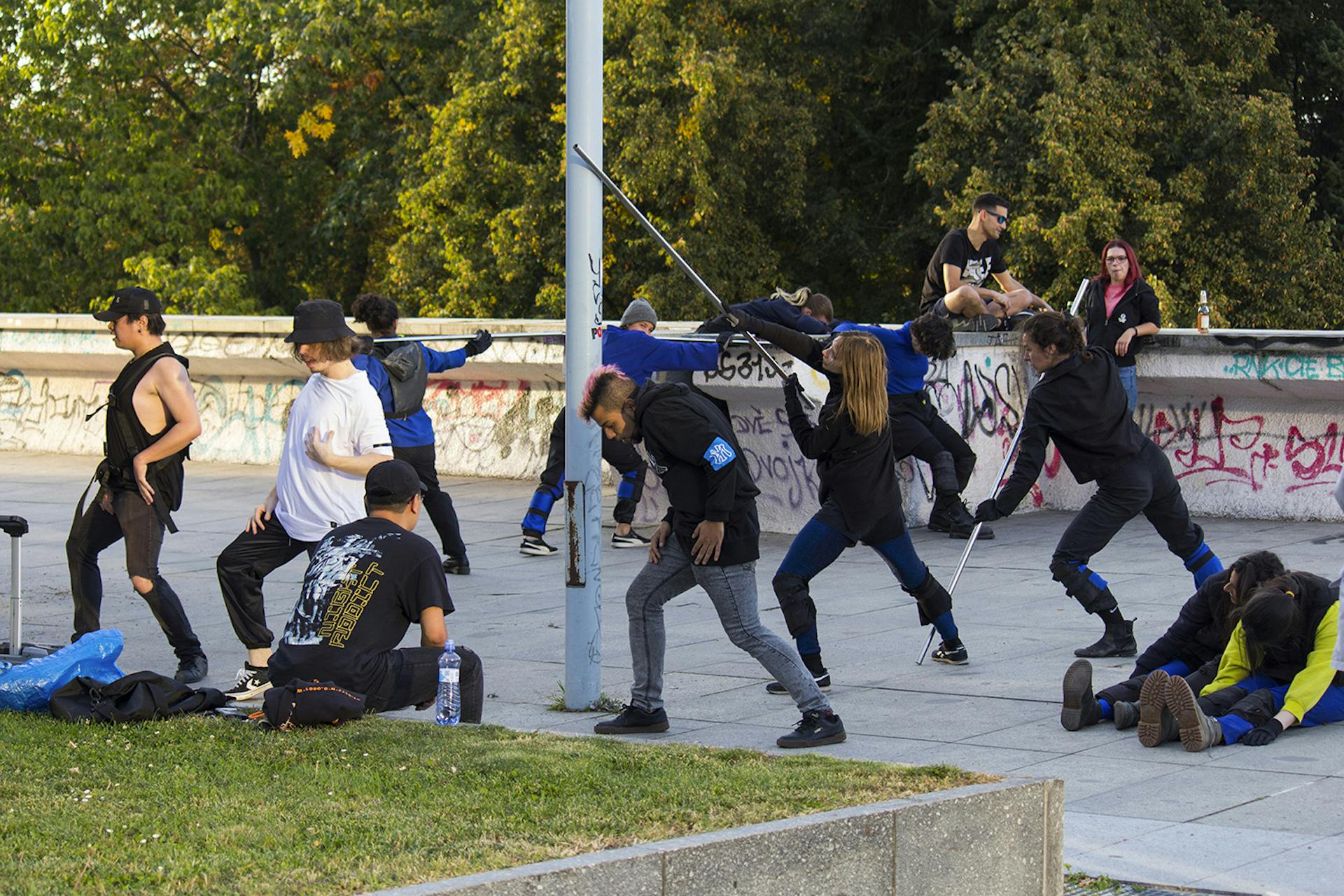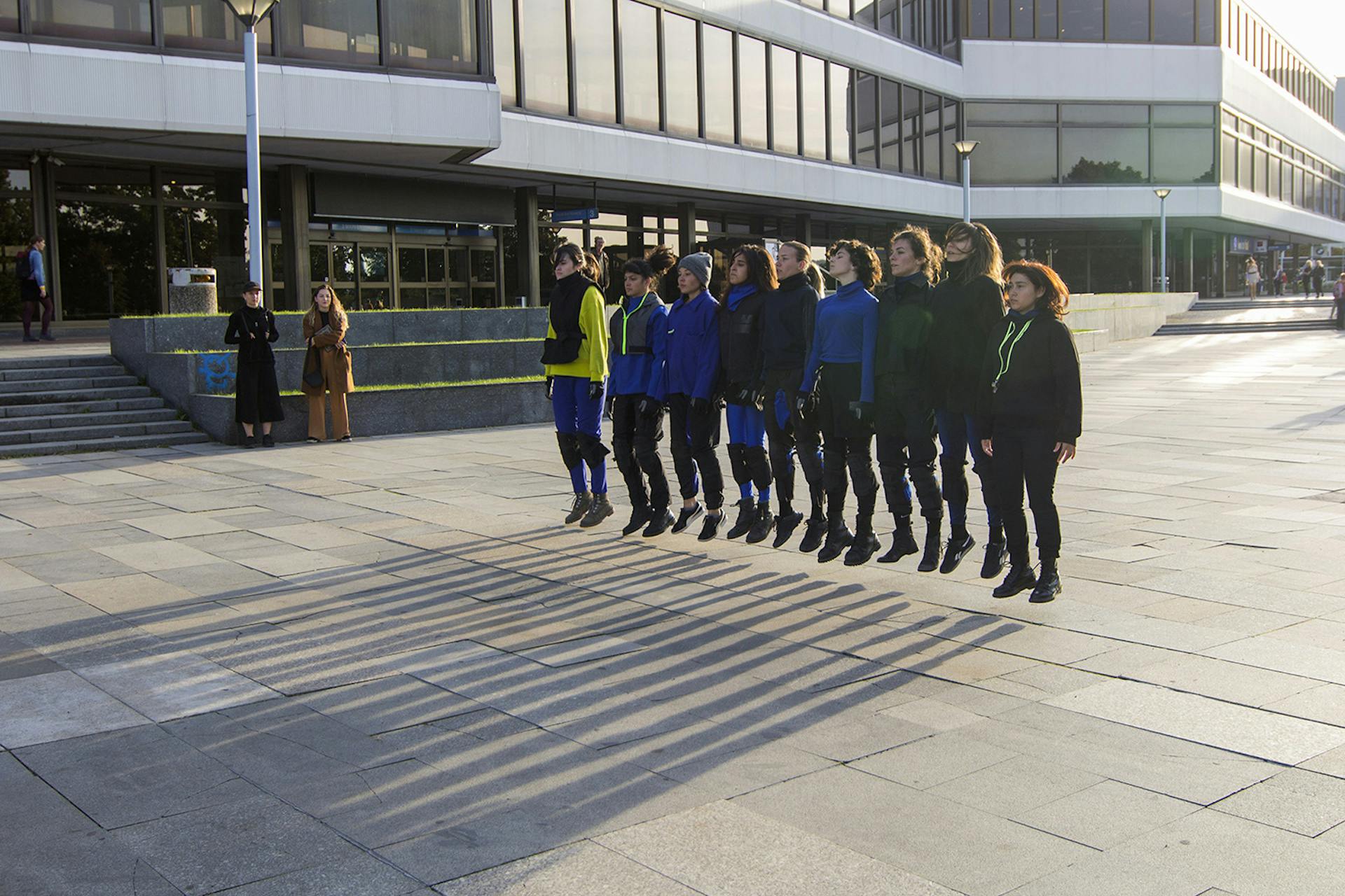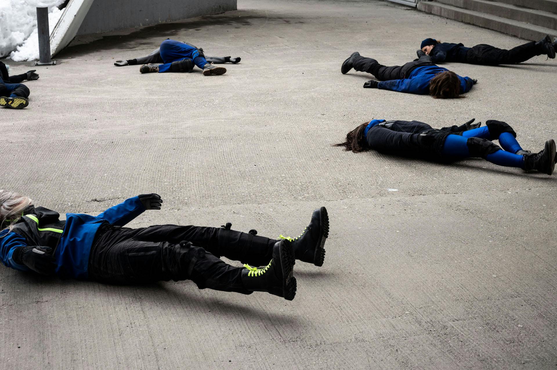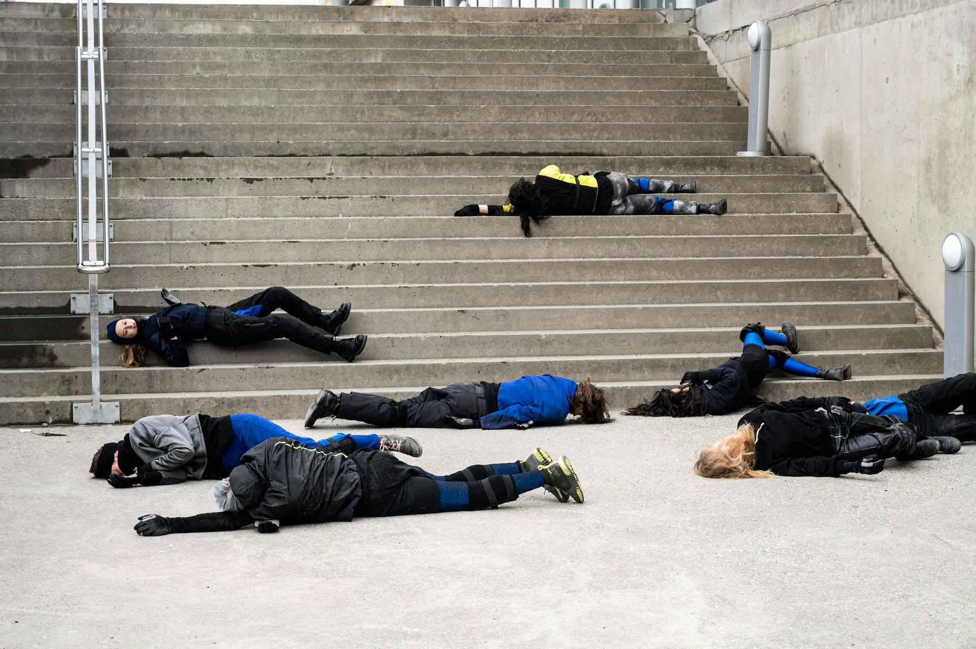 A group of performers drag, carry, and support each other through the city. Almost like a slow painting in motion, their movements appear and disappear among the passersby, merging a long-lasting choreographic composition with the architectural and social patterns of the city.