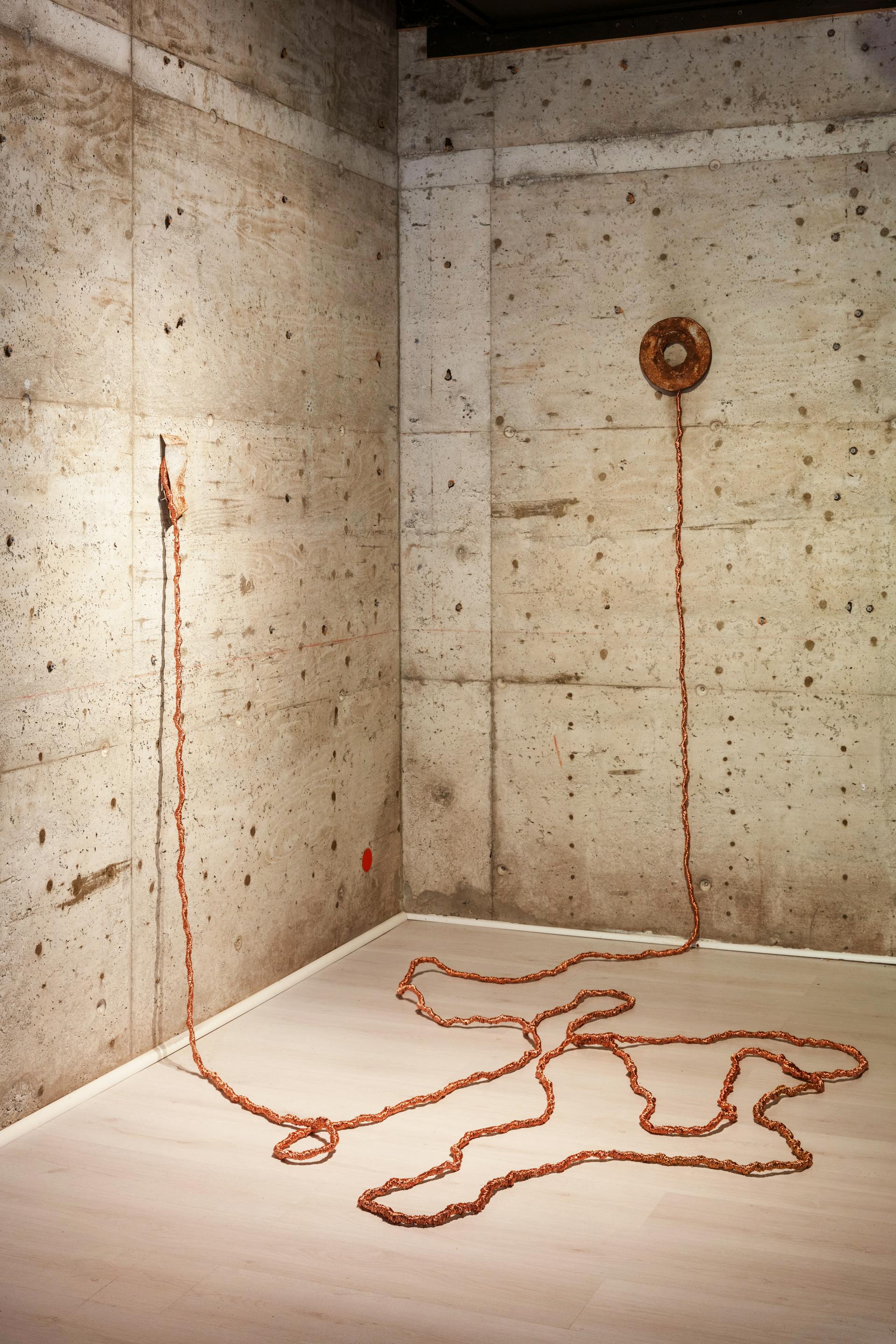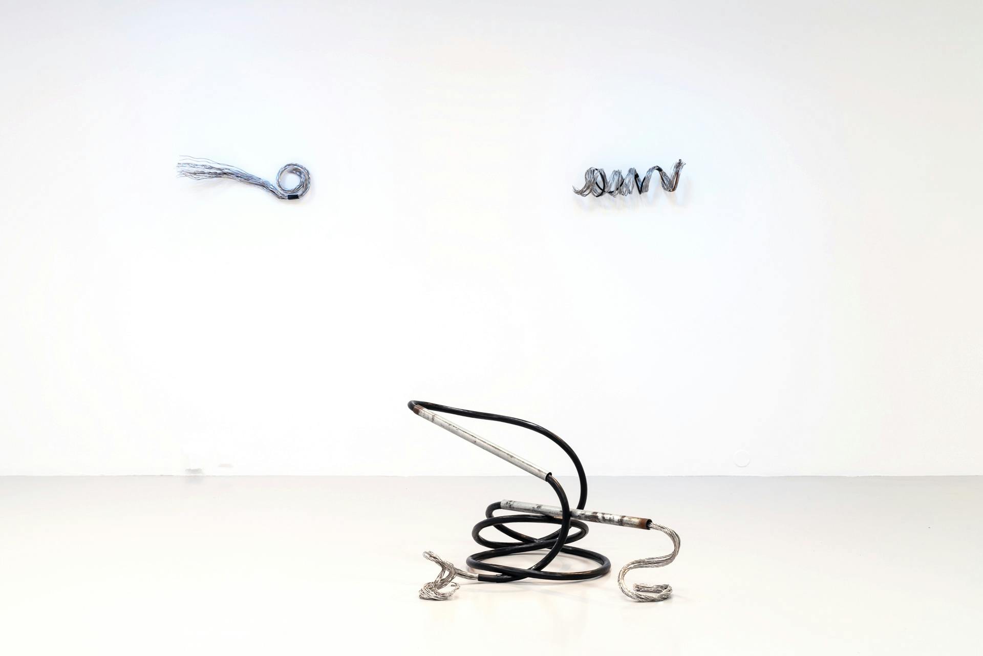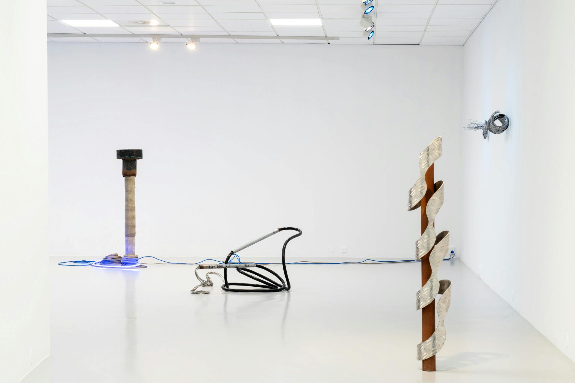 Boundaries and barriers are recurring motifs in Hisse’s artistic practice. References to obstacles and hindrances are found in several works in the exhibition. We can recognize the rigid structures and visual language that often confront us in public space. The materials in her sculptures stem from this sphere. They often consist of metal elements from the infrastructure around us.