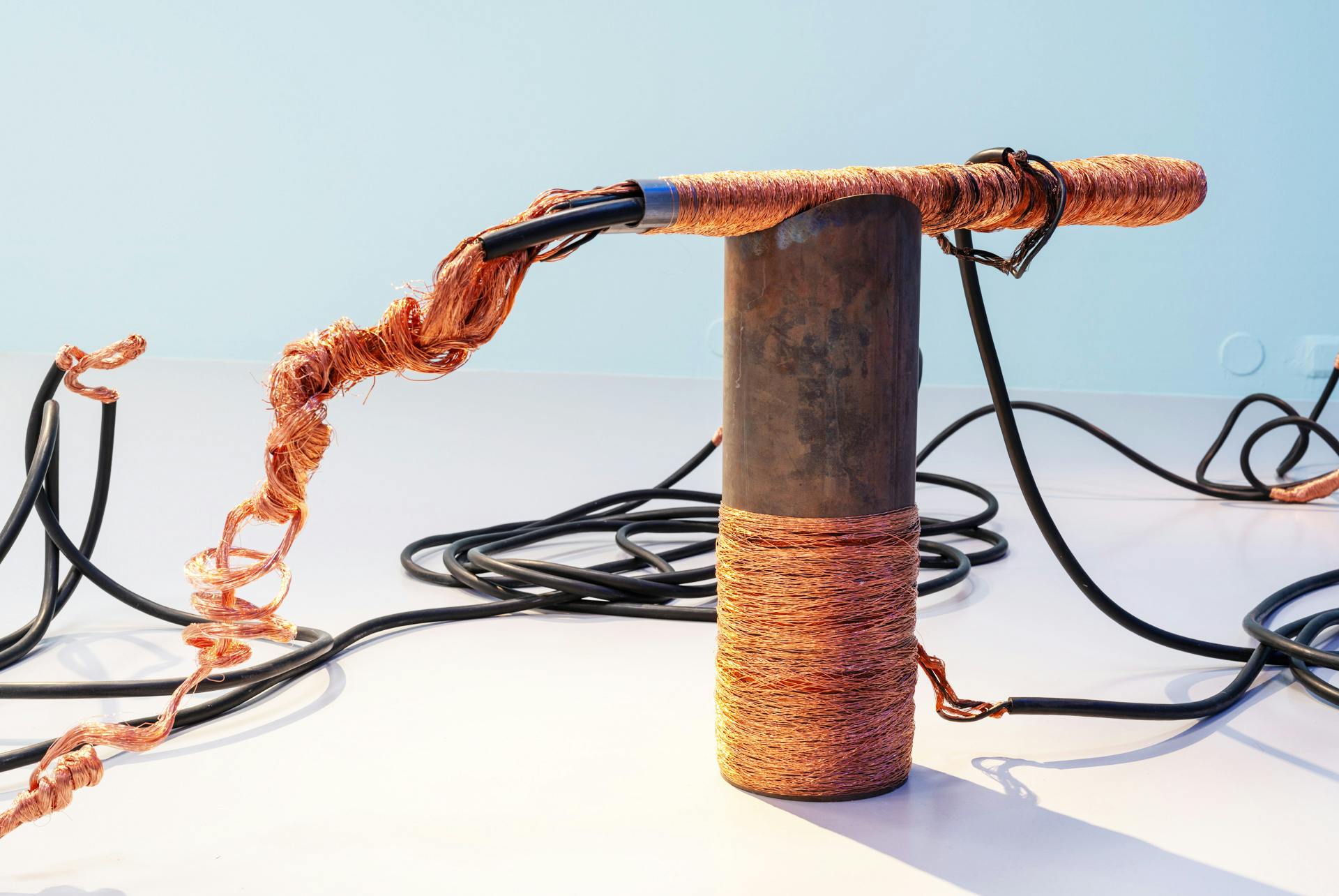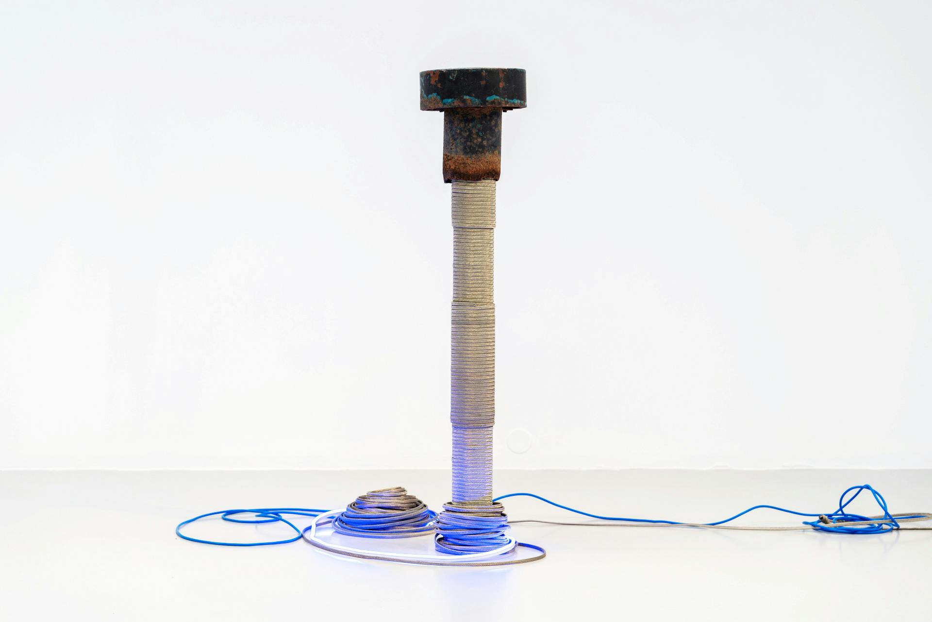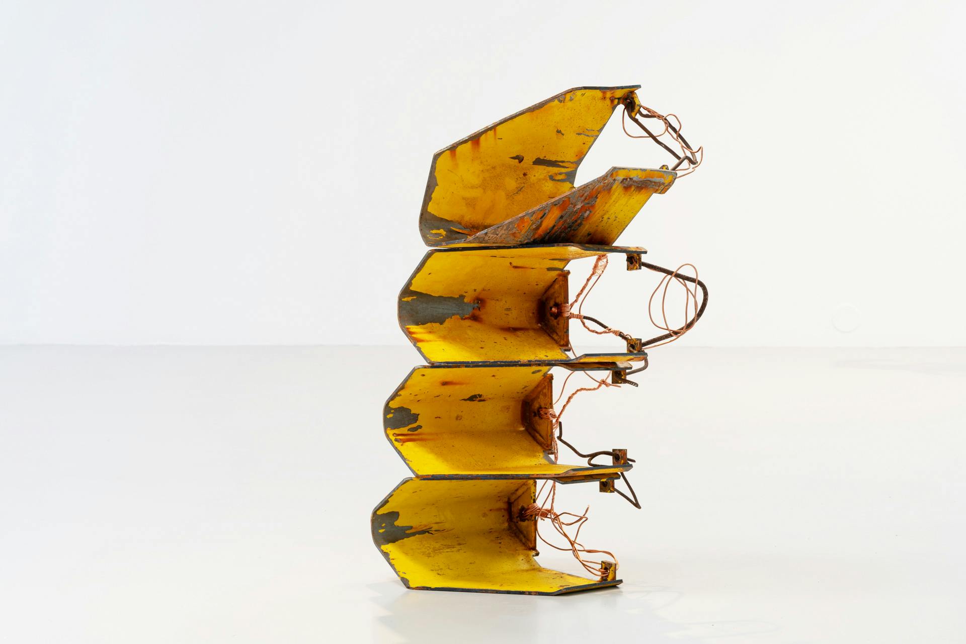 Boundaries and barriers are recurring motifs in Hisse’s artistic practice. References to obstacles and hindrances are found in several works in the exhibition. We can recognize the rigid structures and visual language that often confront us in public space. The materials in her sculptures stem from this sphere. They often consist of metal elements from the infrastructure around us.